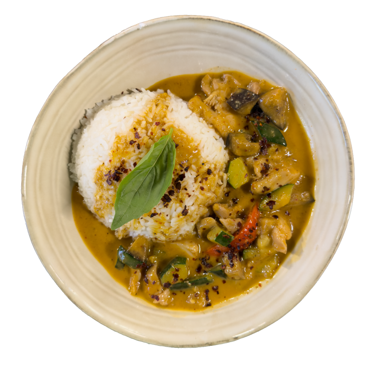 Légumes cuits dans un lait de coco épicé au curry rouge, feuilles de citronnelle et bouillon thaï accompagné de riz thaï parfumé
