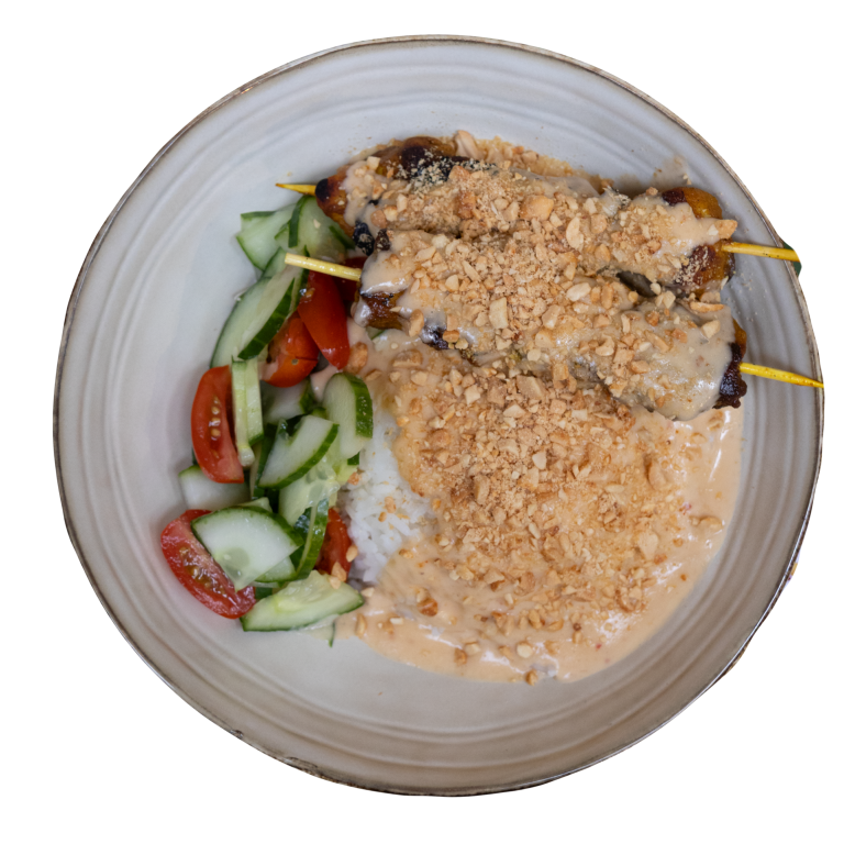 2 brochettes de poulet mariné avec sa sauce Satay accompagné de riz thaï parfumé et d’une salade de concombres assaisonnée d’une sauce fraîcheur