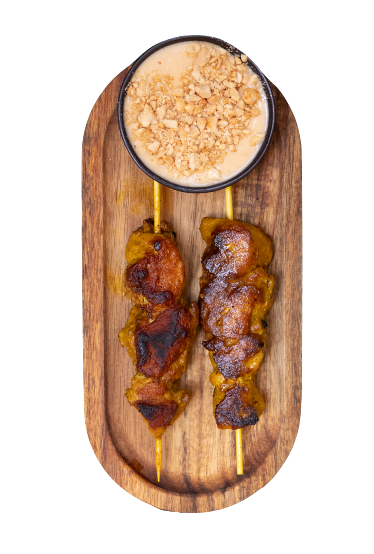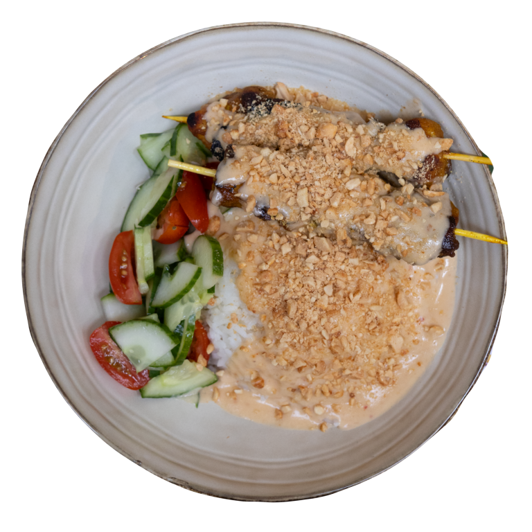 2 brochettes de poulet mariné avec sa sauce Satay accompagné de riz thaï parfumé et d’une salade de concombres assaisonnée d’une sauce fraîcheur
