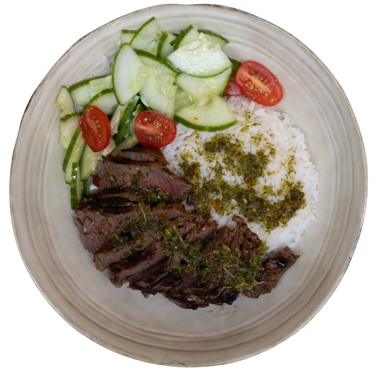 Boeuf mariné à peine snacké avec sa sauce Tigre autour d’une citron vert et de la coriandre accompagné de riz thaï parfumé et d’une salade de concombres assaisonnée d’une sauce fraîcheur
