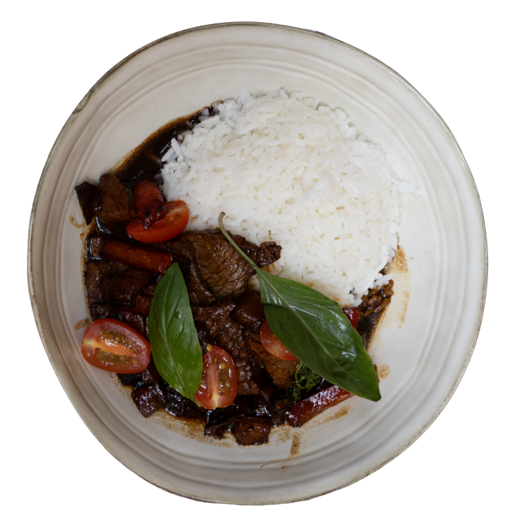 Légumes sautés avec feuilles de basilic thaï, sauce fonce et poivre blanc thaï accompagne de riz thaï parfumé