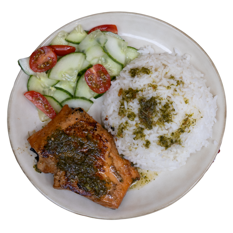 Mi cuit de sauce avec sa sauce citron vert et de la coriandre accompagné de riz thaï parfumé et d’une salade de concombres assaisonnée d’une sauce fraîcheur