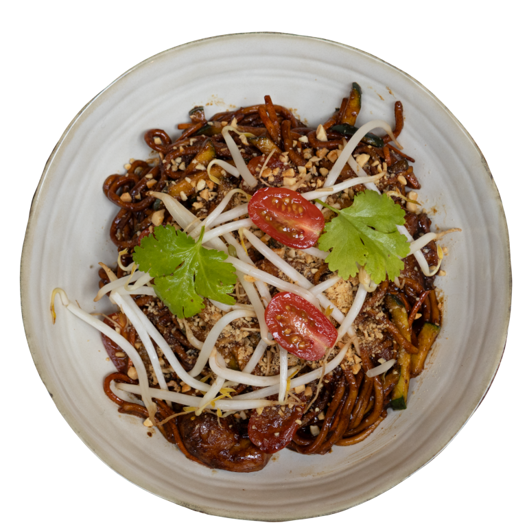 Nouilles de blé et légumes croquants sautés à la sauce soja noir et poivre blanc