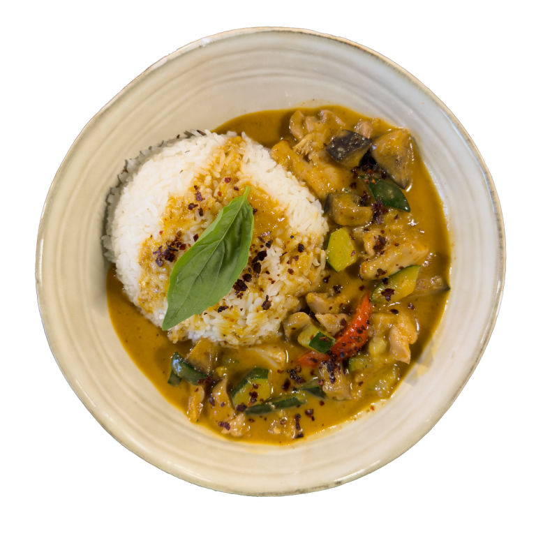 Légumes cuits dans un lait de coco épicé au curry rouge, feuilles de citronnelle et bouillon thaï accompagné de riz thaï parfumé