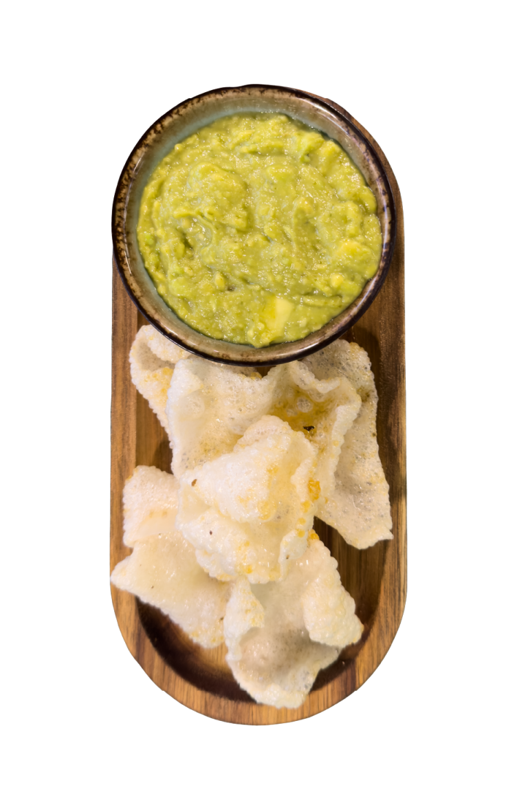 Guacamole aux épices et herbes thaïlandaises accompagné de chips de riz